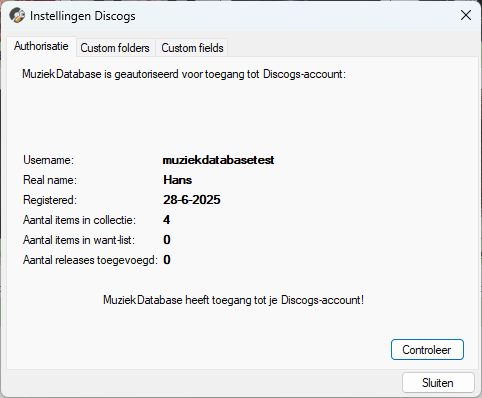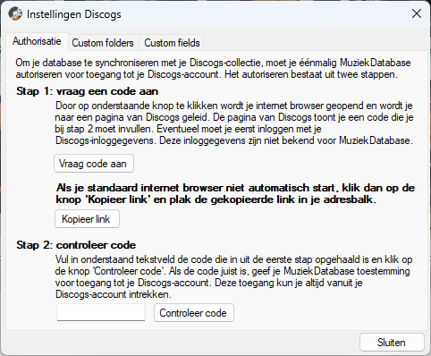 De code van Discogs kun je plakken in MuziekDatabase. Als je op de knop 'Controleer code' klikt, communiceert MuziekDatabase met Discogs en bij gebruik van de juiste code is MuziekDatabase geautoriseerd voor toegang tot je Discogs-account.