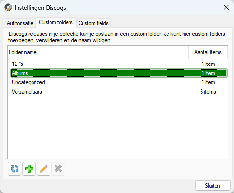 Deze folders kun je ook vanuit MuziekDatabase beheren. Het formulier 'Instellingen Discogs', tabblad 'Custom folders' toont dezelfde folders.